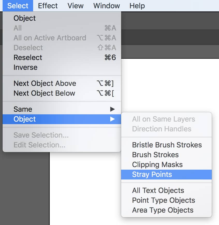 - Go to Select > Object > Stray Points, and if you have any Illustrator will highlight them.